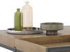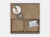3D model of black metal based coffee table with wooden tray top divided in four.